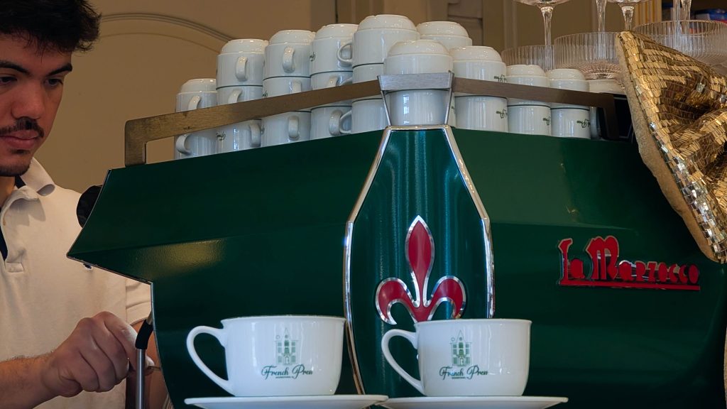 Barista preparing coffee at The French Press, displaying artisanal coffee and a welcoming atmosphere.A stunning chandelier illuminating the high ceiling; cultivating a rich, elegant ambiance in the main seating area.People swipe and sip as the sun peeks through. Silver cutlery and ceramic dishware is left behind from a weekend’s breakfast rush.A cozy corner in the shop where patrons enjoy their time in a relaxed setting before tackling the day ahead.Patrons wants to start their day in peace. Coffee and peace– what more could one ask for?A beautifully decorated porch at The French Press bids patrons adieu as they head towards the street with a caffeinated mind and body ready to seize the day.