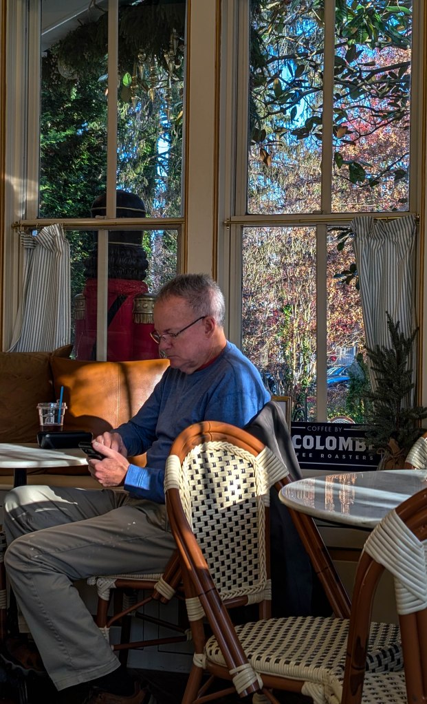 Holiday decor welcomes customers at the entryway doors. The smell and sound of fresh La Colombe coffee being ground greets them upon entrance.